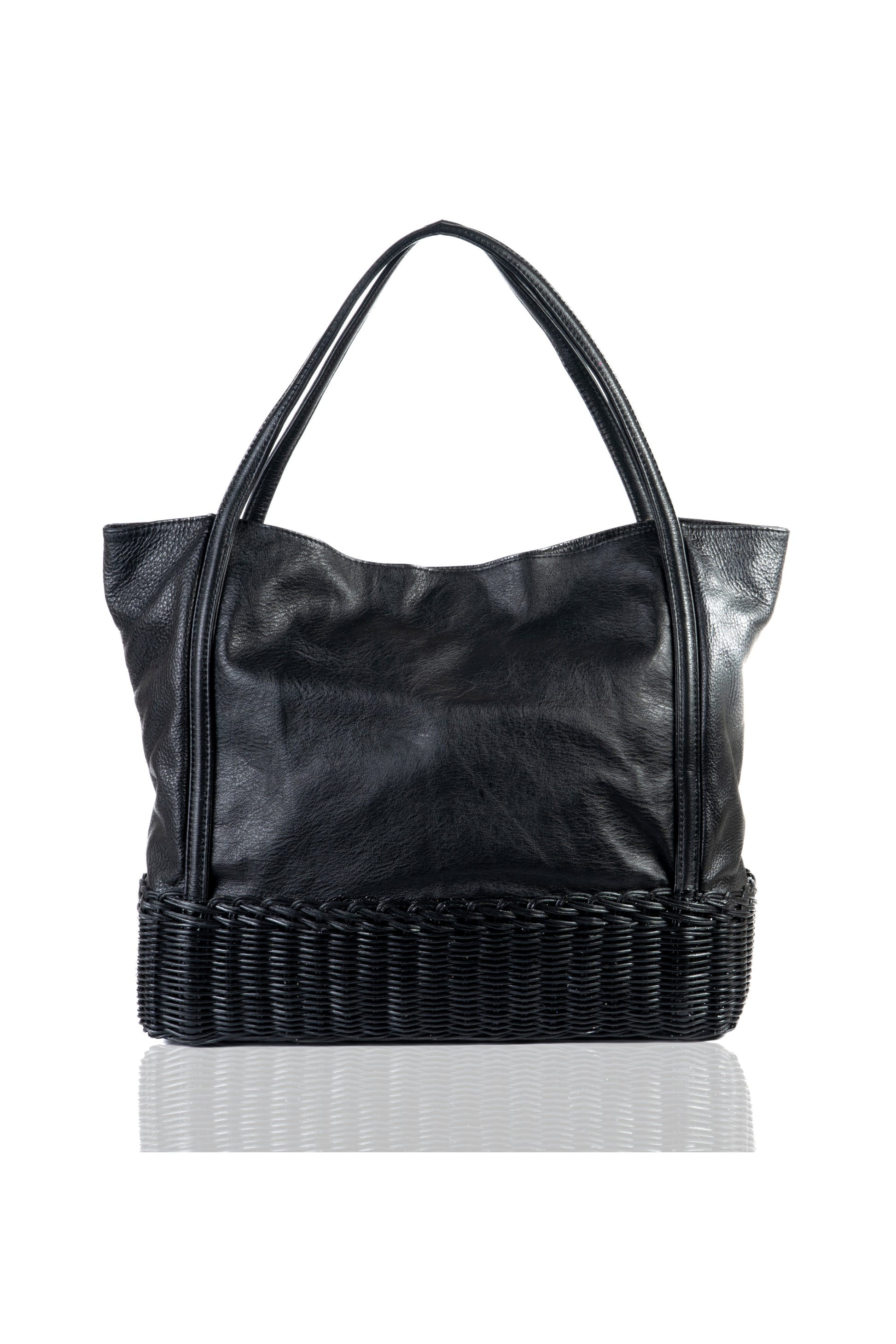 calfskin leather + natural fiber wicker + fabric liner.